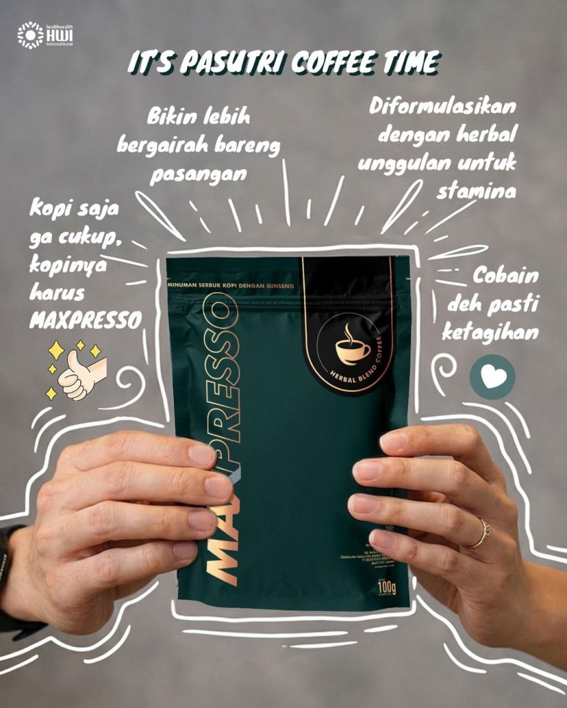 “MaxPresso: Minuman kopi yang dikombinasikan dengan herbal khusus yang bermanfaat untuk meningkatkan stamina dan vitalitas pria..”